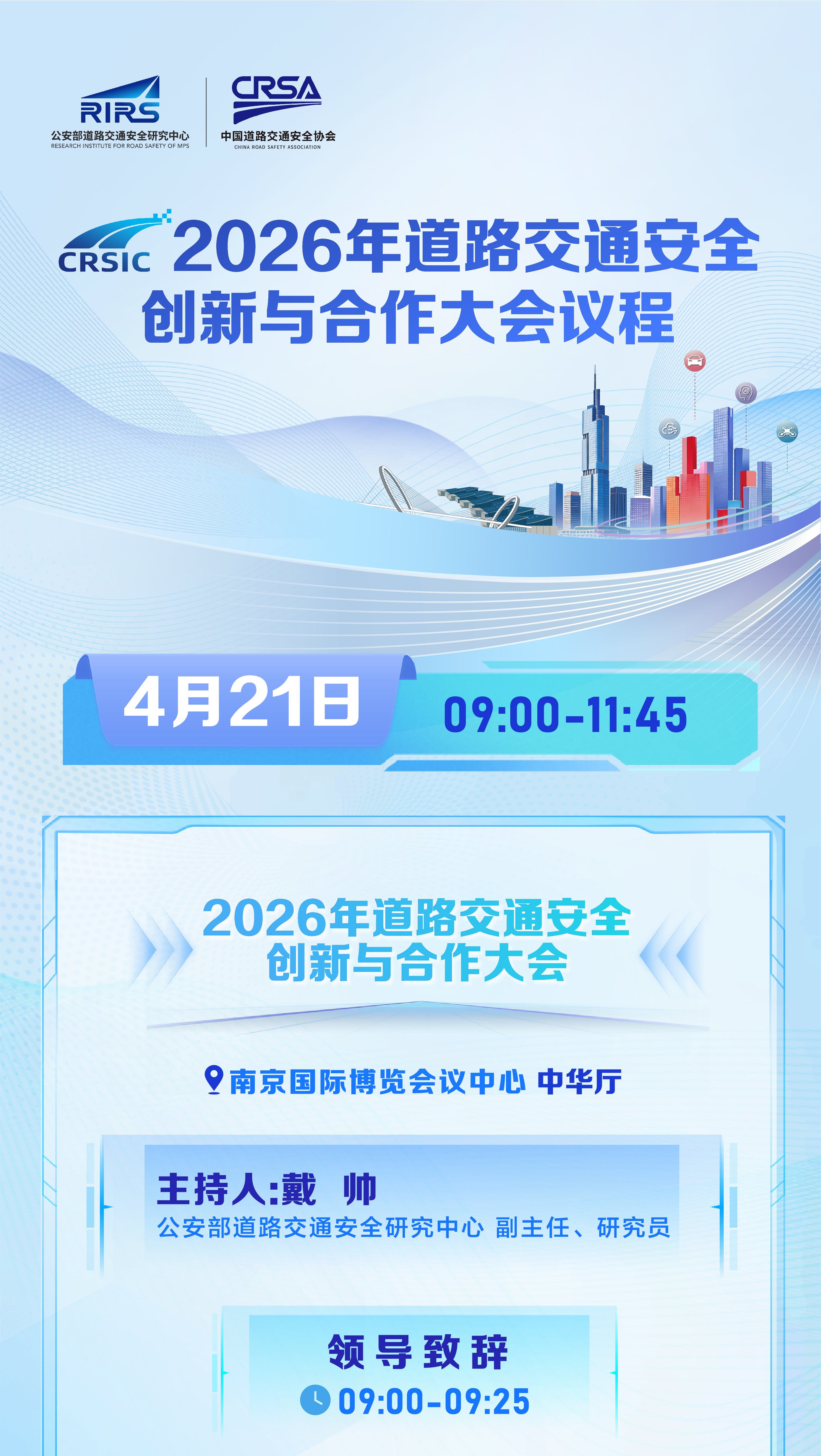 经公安部批准,由公安部道路交通安全研究中心与中国道路交通安全协会共同主办的2026年道路交通安全创新与合作大会(以下简称大会),将于2026年4月21日在南京国际博览会议中心举办。大会以“慧聚金陵 路畅行安”为主题,邀请国内外道路交通安全领域权威专家、知名学者、行业精英及公安交管一线骨干代表参会,聚焦自动驾驶运行安全体系构建、道路交通安全新特征与对策、数智化交管创新实践等议题开展深入交流与成果分享,集中探讨交通安全领域前沿理论、核心技术与交管成效,不断凝聚全社会交通安全共治合力,推动构建科学化、精细化、智能化的现代道路交通安全治理体系,为保障人民群众出行安全、维护社会大局稳定、服务经济社会高质量发展提供坚实支撑。