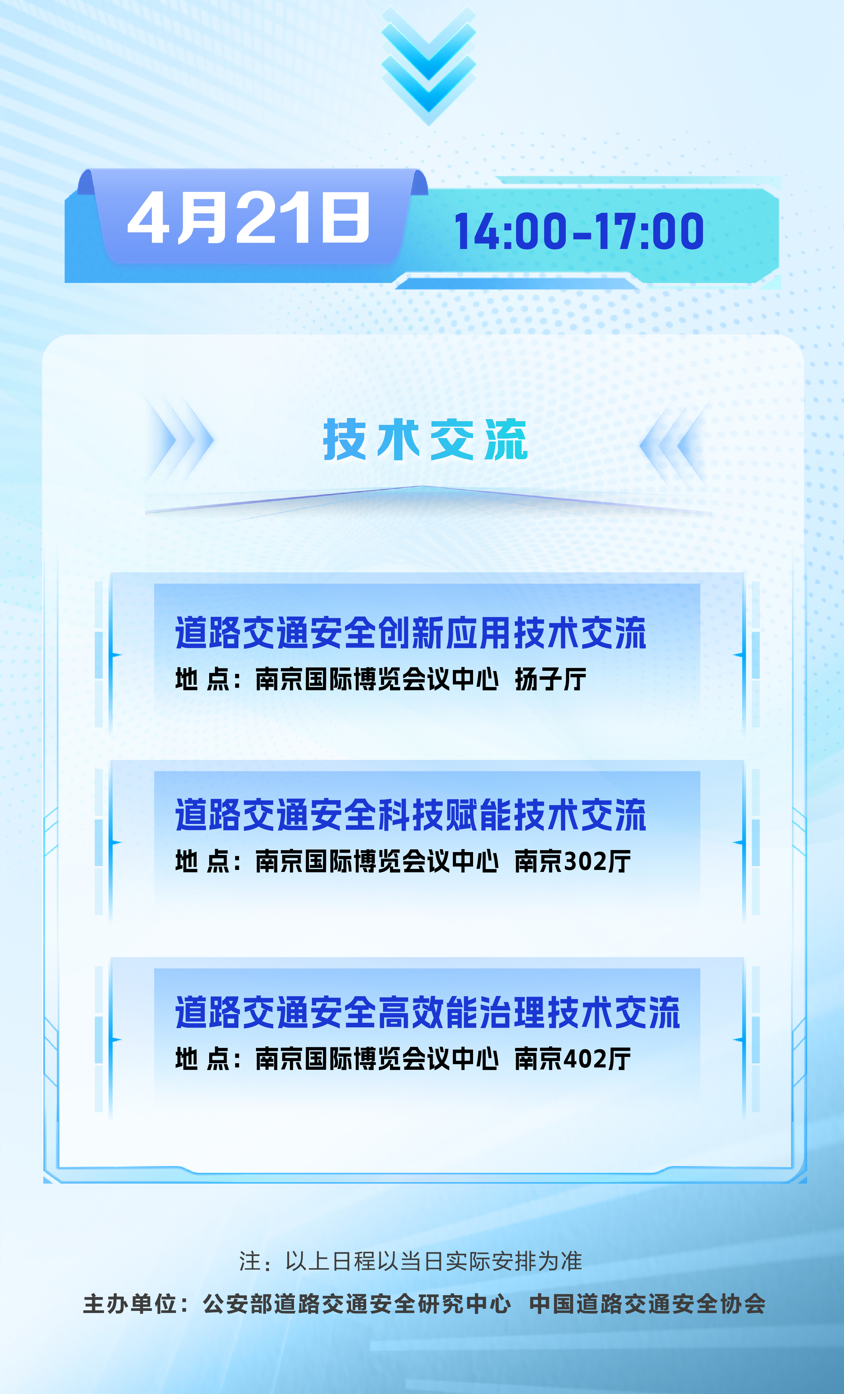 下午,三场聚焦道路交通安全创新应用、科技赋能、高效能治理的技术交流活动将同期举办。