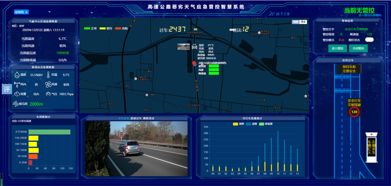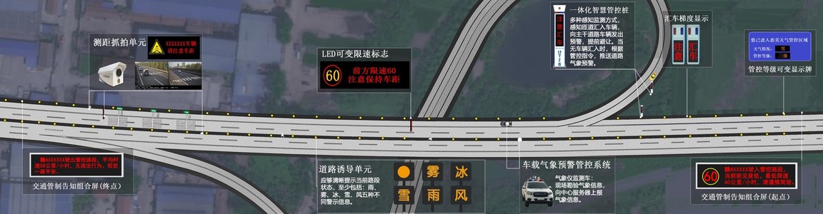通过“感气象、示路况、降车速、警汇车、动巡防”五大方面,提升恶劣气象下的行车安全系数:通过智能可变限速管理,达到降车速的目的;通过车距预警管理,达到控制车辆间距的目的;通过车辆诱导系统,亮化公路可视条件,实现恶劣气象下强化道路指引的目的;通过汇流警示管理,实现对驶入汇车路段的机动车预警提醒。
