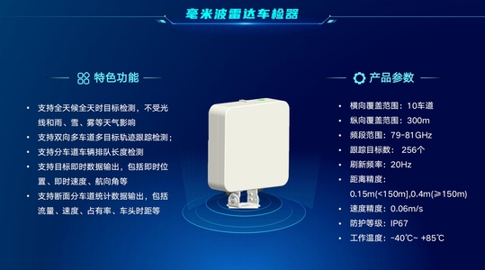 交通毫米波雷达:轨迹跟踪、事件检测,该产品可应用于路口、路段、匝道、快速路、高速公路、隧道等场景。